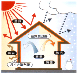住宅の屋根、外壁、内装に塗ることで、太陽光線や熱、音や汚れなどを跳ね返し、断熱・遮熱などの効果を発揮します。