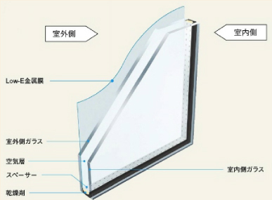 LOW-Εガラスとは、ガラスの表面に特殊なコーティング処理(金属及びその酸化物等で構成された非常に薄い膜)をして、熱の伝達をにしくくする働きをしています。
