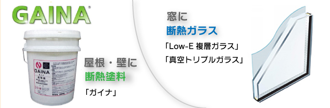 当社では、屋根・壁には「断熱塗料 ガイナ」を、窓には「断熱ガラス」を推奨しています。